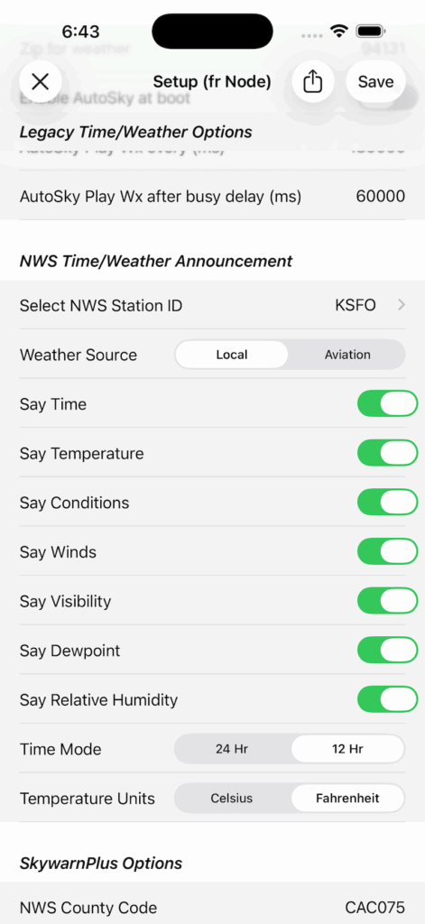 Now let’s look at how this new service is configured – tap on “Node Details” > “AllStar Setup” and scroll down to “NWS Time/Weather Announcement”.